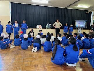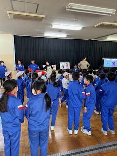 2025.11.11 全校生 英語の絵本に親しもう 図書・掲示委員会の企画で、長休み時間に英語の絵本に親しみました。 ALTの先生が、英語の大型絵本を読んでくださいました。 みんなは、絵本の挿絵を見ながら動きをまねて、体を動かしました。 次は、25日にも行われます。楽しみですね。