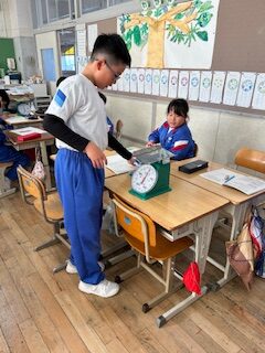 2025.12.10 3年生 3年生 重さを量ろう 算数の時間に、重さを量る学習をしています。 はかりの皿の上に身の回りのいろいろな物を乗せて、量ってみました。 意外と重いんだな、という声が聞かれました。 重さの概念も身に付きますね。